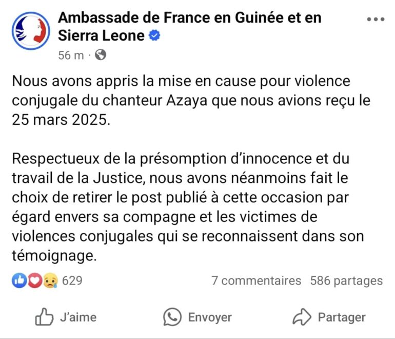 L’ambassade de France en Guinée et en Sierra Leone fait rétropédalage. Il y a quelques heures, sur sa page facebook, elle avait retiré son post dans lequel elle retire son soutien à l’artiste chanteur Azaya qui se prépare pour un concert le 13 décembre prochain à l’Arena à Paris et au Canada.