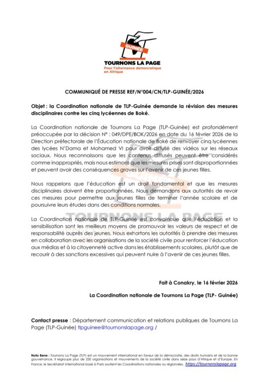 Dans un communiqué dont copie est parvenue à notre rédaction, la Coordination nationale de Tournons La Page (TLP-Guinée) se dit profondément préoccupée par la décision N°: 049/DPE/BOK/2026 en date du 16 février 2026 de la Direction préfectorale de l’Éducation nationale de Boké de renvoyer cinq lycéennes des lycées N’Dama et Mohamed VI pour avoir diffusé des vidéos sur les réseaux sociaux.