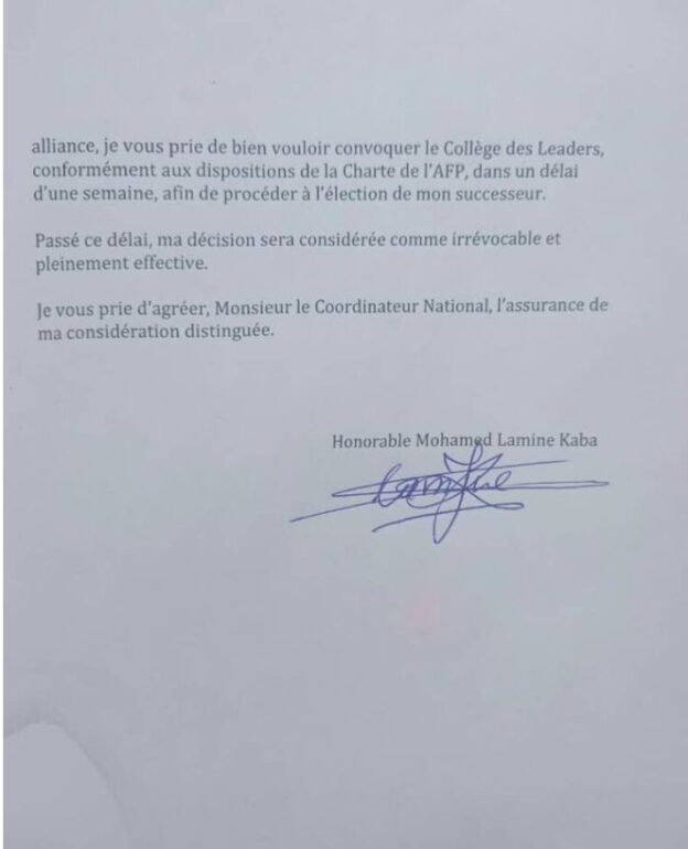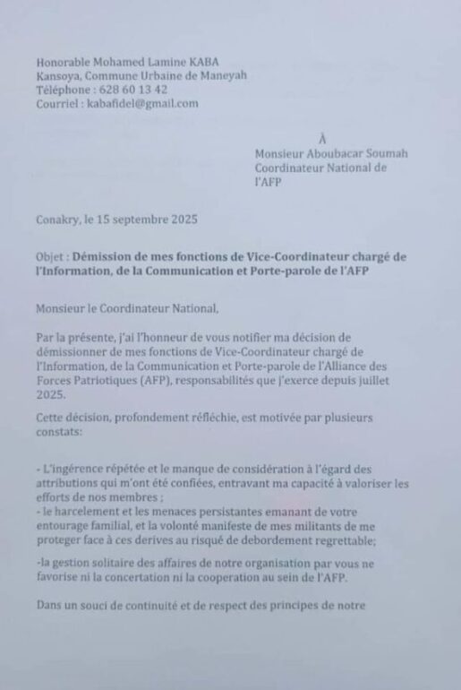 Le Coordinateur de l’information et de la communication et porte-parole de l’Alliance des Forces Patriotes a décidé de marqué pour l’instant des activités de l’AFP. Mohamed Lamine Kaba puisse que c’est de lui qu’il s’agit a adressé une lettre à son coordinateur national, Aboubacar Soumah où il a mentionné sa démission du poste qu’il occupait jusque-là.