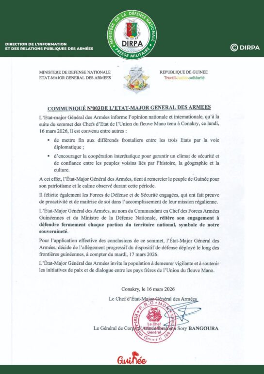 Au lendemain du sommet des Chefs d’État de l’Union du fleuve Mano tenu à Conakry le 16 mars 2026, l’État-major général des Armées acte un tournant vers la désescalade. Saluant le choix de la voie diplomatique pour régler les différends frontaliers avec la Sierra Leone et le Libéria, il annonce un allègement progressif du dispositif militaire, tout en réaffirmant son engagement à défendre l’intégrité territoriale et en appelant à la vigilance citoyenne.