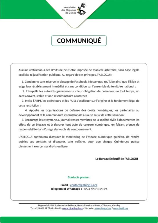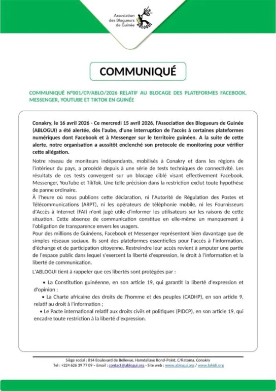 L’Association des blogueurs de Guinée (ABLOGUI) alerte sur une interruption jugée délibérée de l’accès à plusieurs plateformes majeures, dont Facebook, Messenger, YouTube et TikTok. Dans un communiqué publié ce 16 avril 2026, l’organisation condamne une atteinte aux libertés numériques, interpelle les autorités sur l’absence d’explications officielles et appelle au rétablissement immédiat d’un accès libre à Internet.