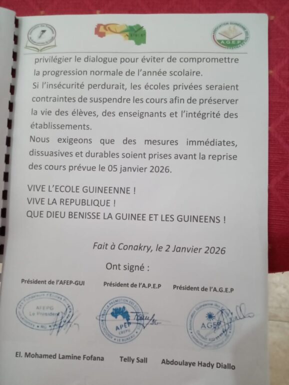 Les fondateurs d’écoles privées, réunis au sein de plusieurs associations ont conféré avec les journalistes ce vendredi 02 janvier 2026. Objectif : revenir sur les récentes perturbations qu’a connu le système éducatif guinéen, plus particulièrement, l’impact que cela a eu sur les écoles privées.