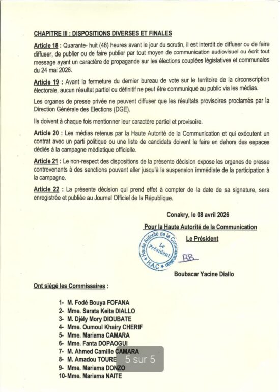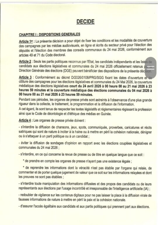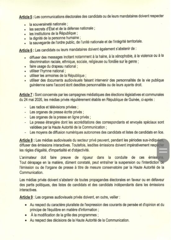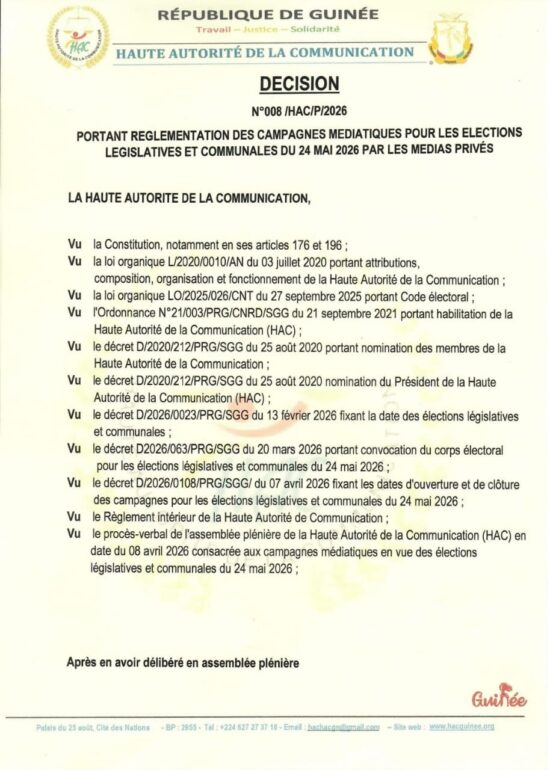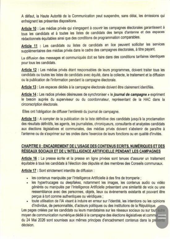 Dans une décision portant règlement des campagnes médiatiques pour les élections législatives et communales du 24 2026 par les médias du secteur privé, la Haute Autorité de la Communication a procédé à la fixation des conditions et les modalités de couverture des campagnes par les médias audiovisuels, en ligne et écrits du secteur privé, conformément aux articles 49 et 71 du Code électoral. La décision est rendue public ce mercredi, 08 avril 2026.