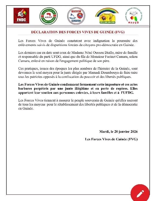 Les Forces vives de Guinée dénoncent des enlèvements et disparitions forcées visant des militants pro-démocratie, citant les cas de Néné Oussou Diallo et de Sékou Camara.