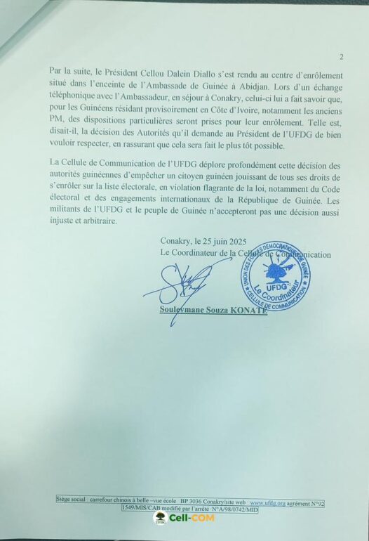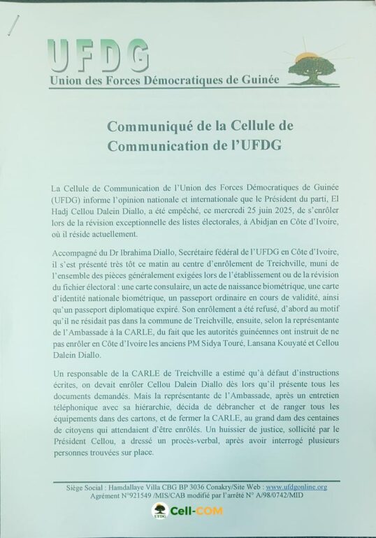 C’est une information qui a d’abord été relayée par des médias. Enfin la Cellule de Communication de l’Union des Forces Démocratiques de Guinée (UFDG) communiqué sur le sujet. Selon nos informations, El Hadj Cellou Dalein DIALLO a été empêché, ce mercredi 25 juin 2025, de s’enrôler lors de la révision exceptionnelle des listes électorales, à Abidjan en Côte d’Ivoire, où il réside actuellement.