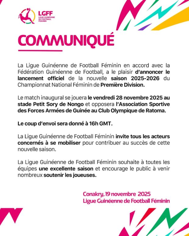 Dans un communiqué officiel, la Fédération Guinéenne de Football Féminin annonce, ce mercredi 19 novembre 2025, le démarrage de la nouvelle saison 2025-2026 du Championnat National Féminin de première division.