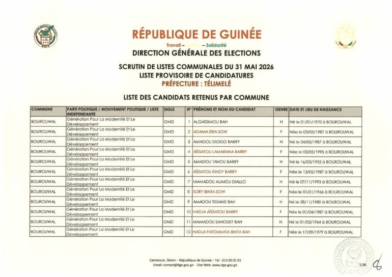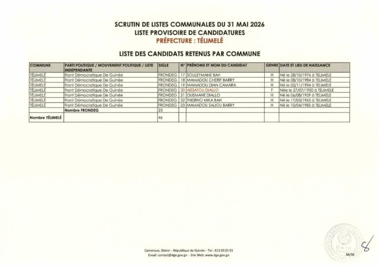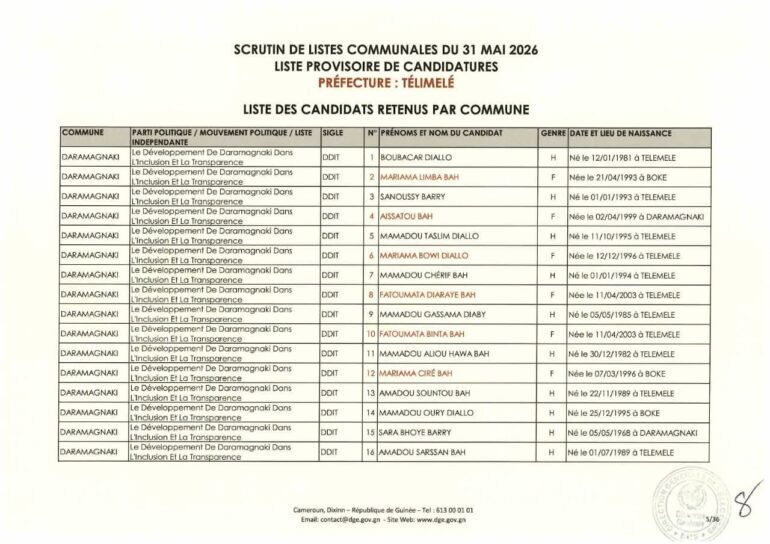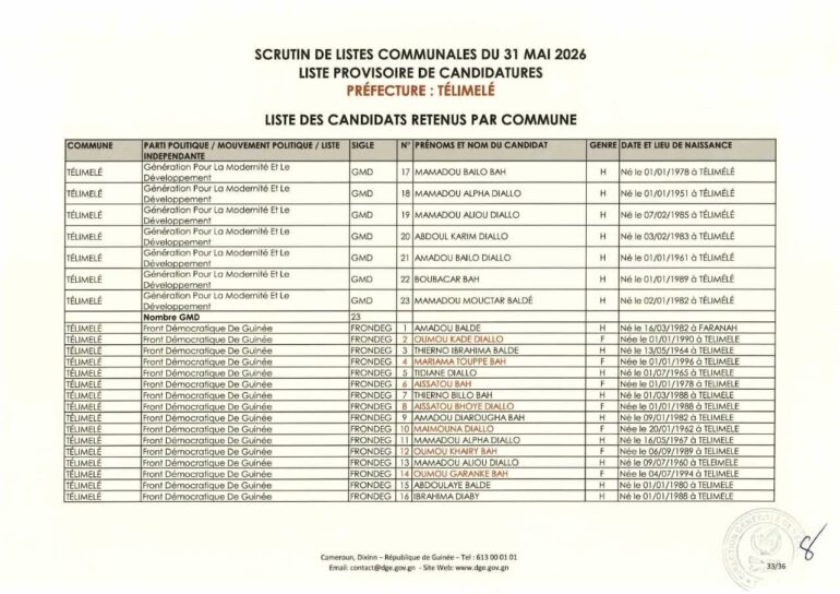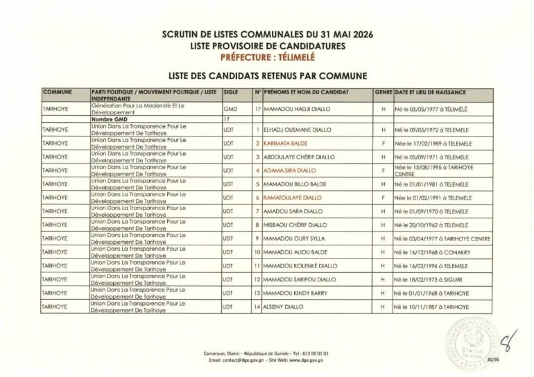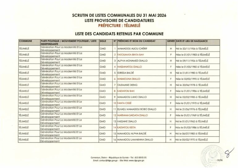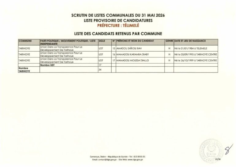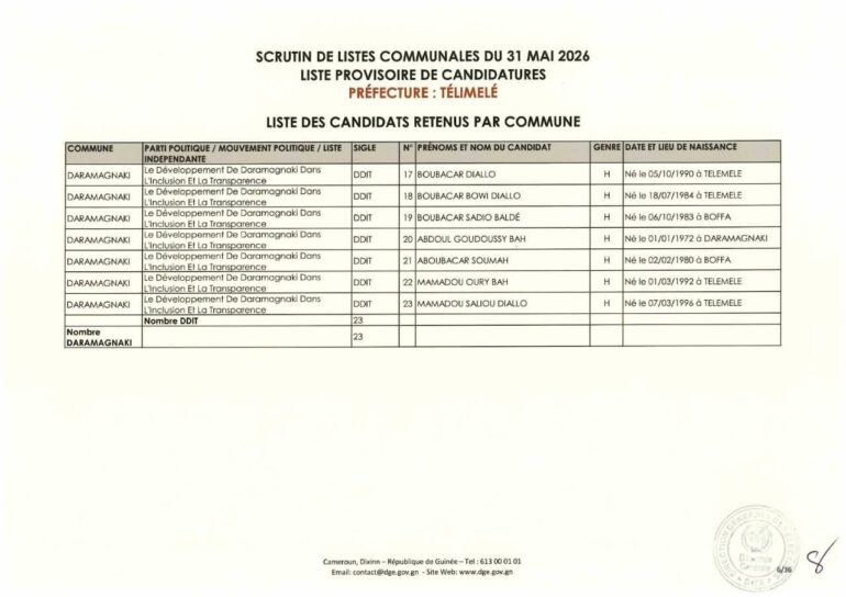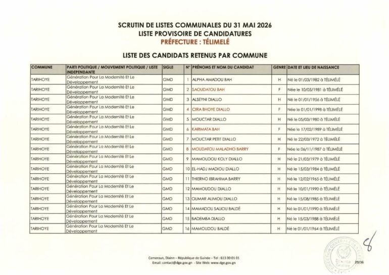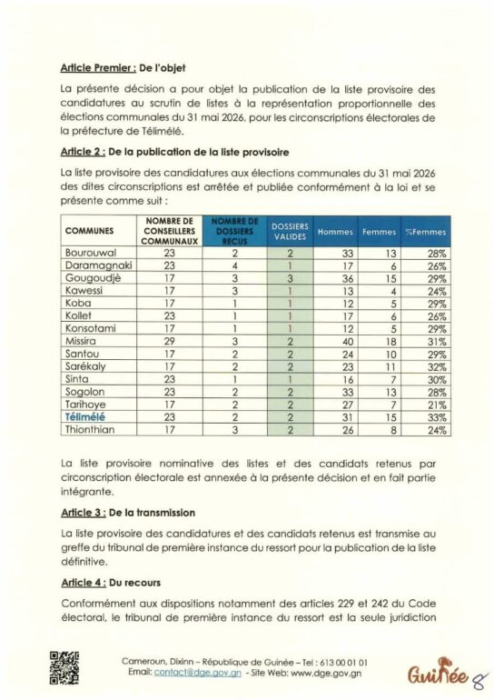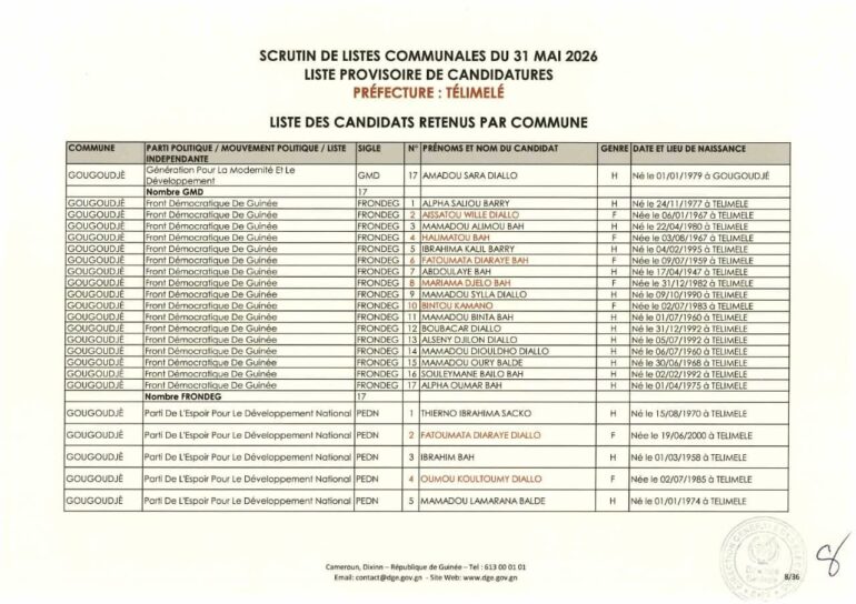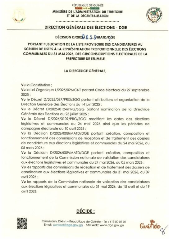 La Direction générale des élections (DGE) a rendu publique une décision portant publication de la liste provisoire des candidatures pour les élections communales du 31 mai 2026 dans la préfecture de Télimélé. Ce document officiel s’inscrit dans le processus électoral en cours, conformément aux dispositions du Code électoral et aux différents décrets encadrant l’organisation du scrutin.