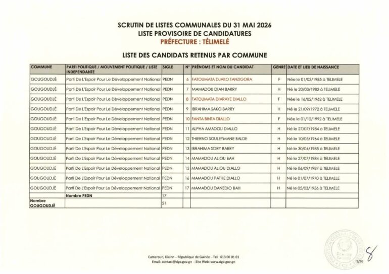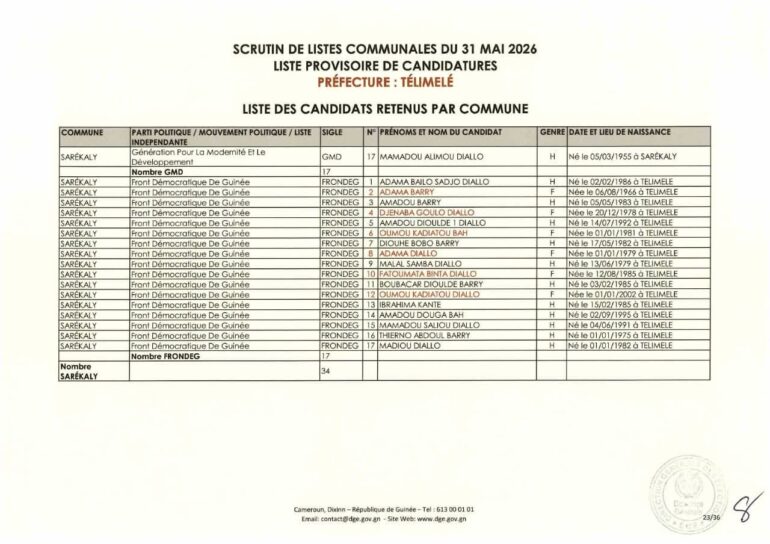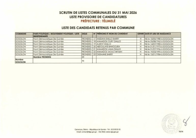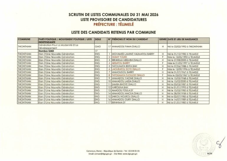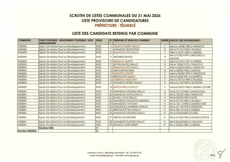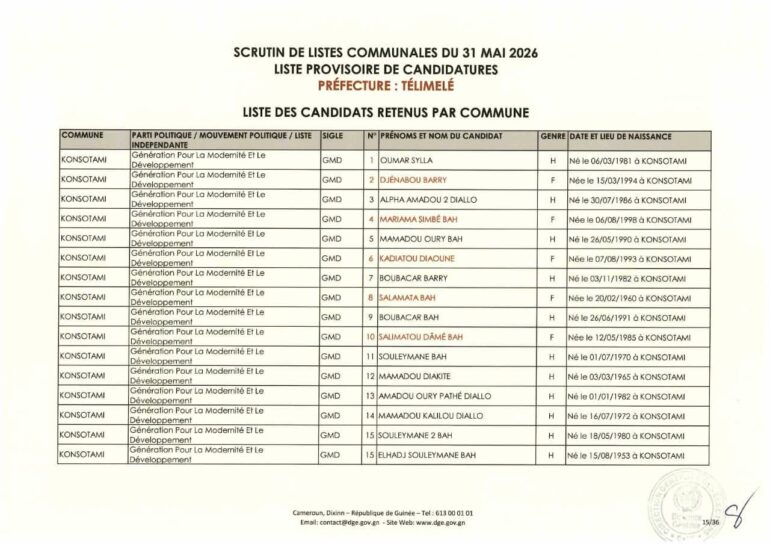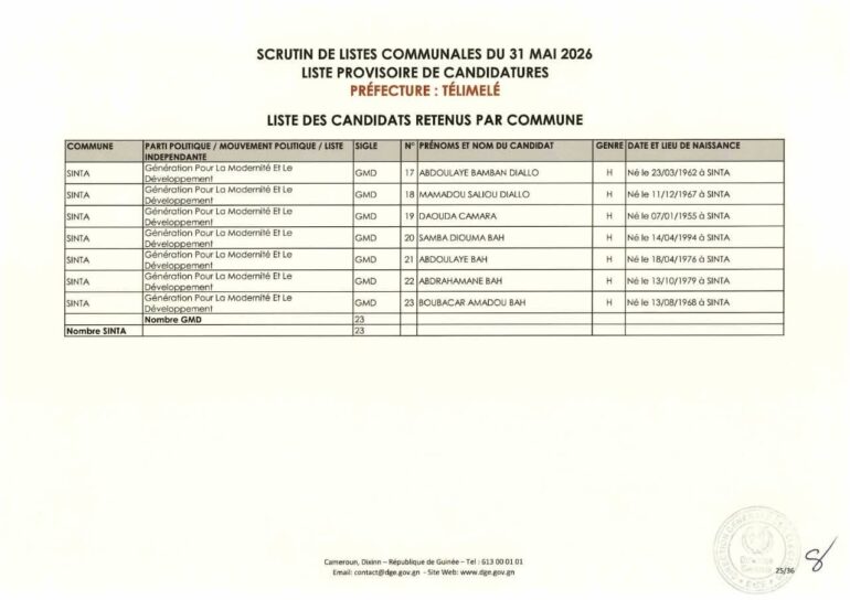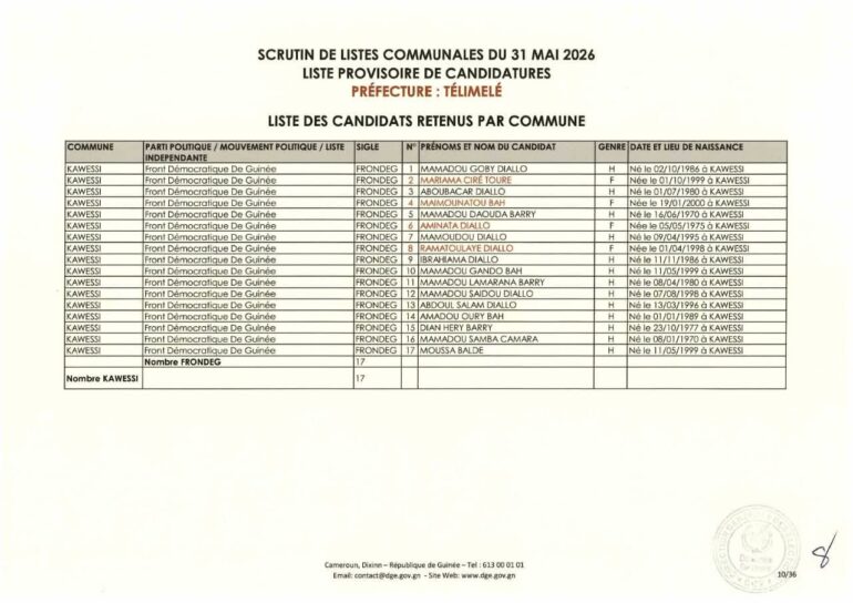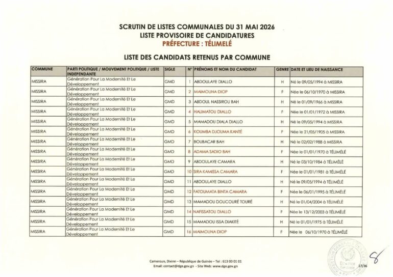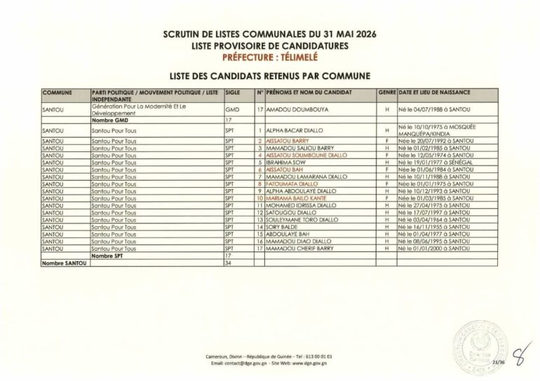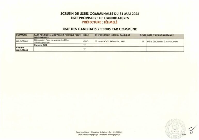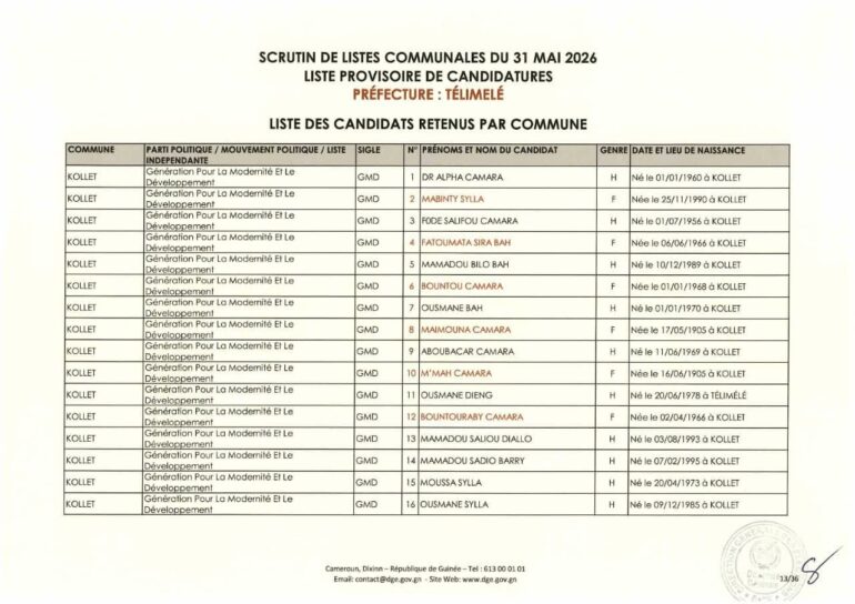 La Direction générale des élections (DGE) a rendu publique une décision portant publication de la liste provisoire des candidatures pour les élections communales du 31 mai 2026 dans la préfecture de Télimélé. Ce document officiel s’inscrit dans le processus électoral en cours, conformément aux dispositions du Code électoral et aux différents décrets encadrant l’organisation du scrutin.