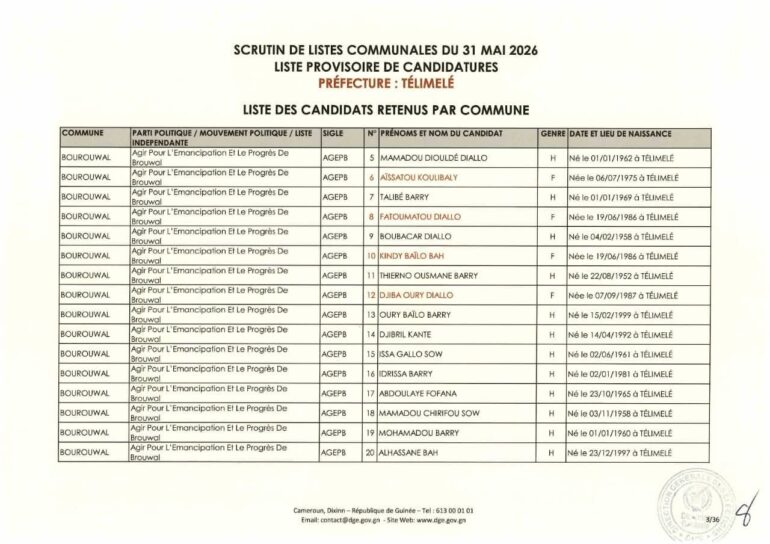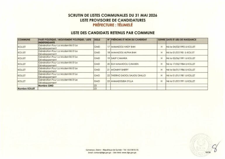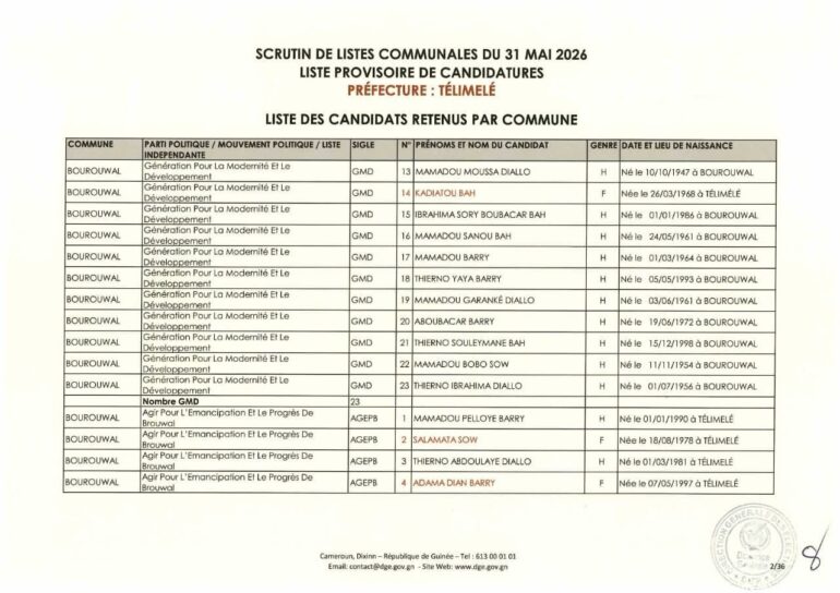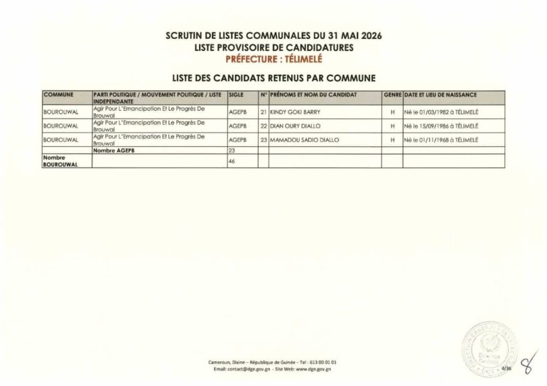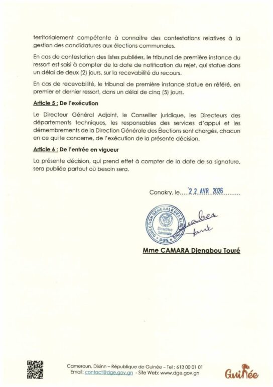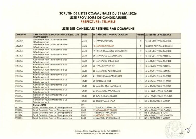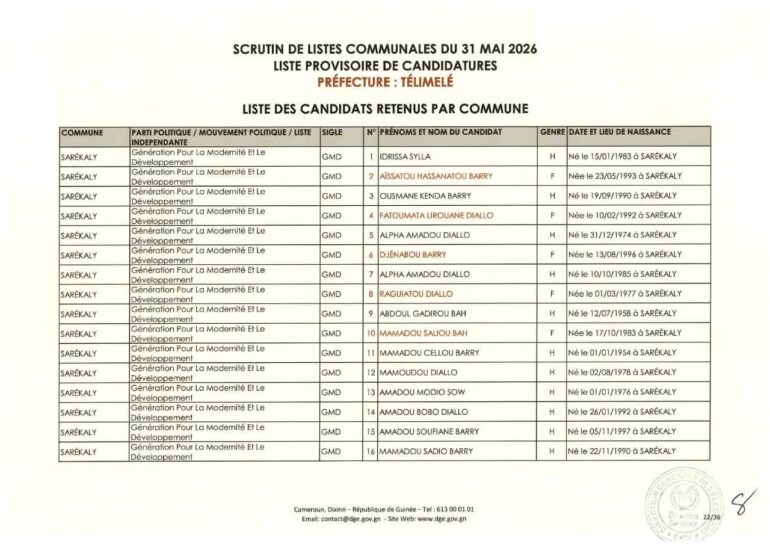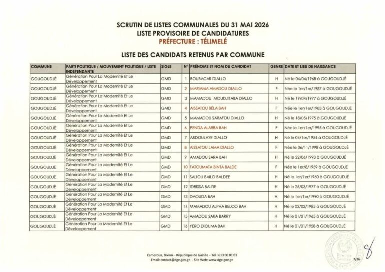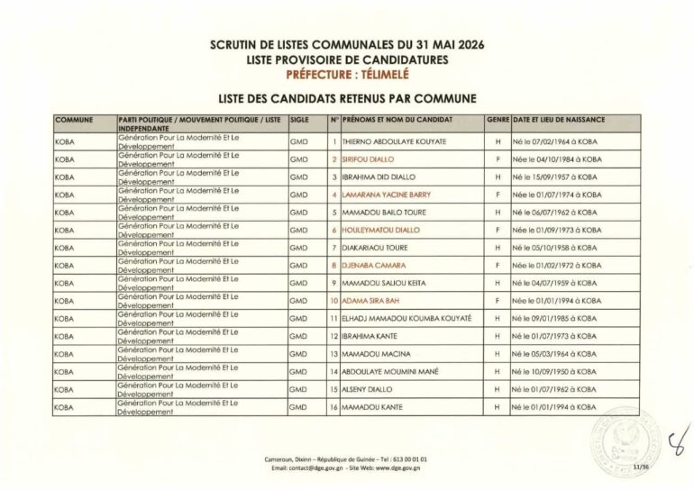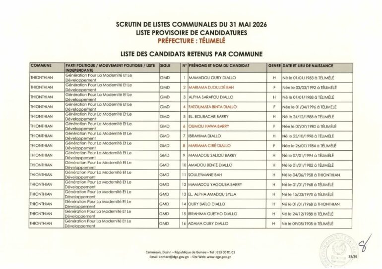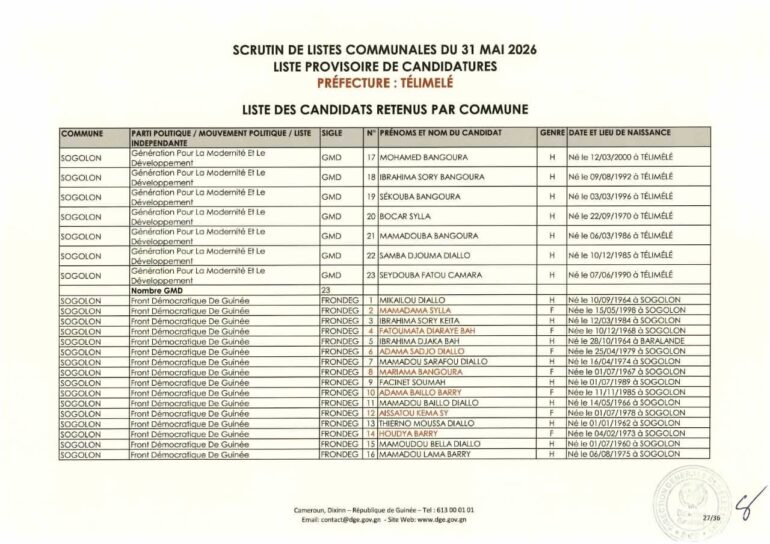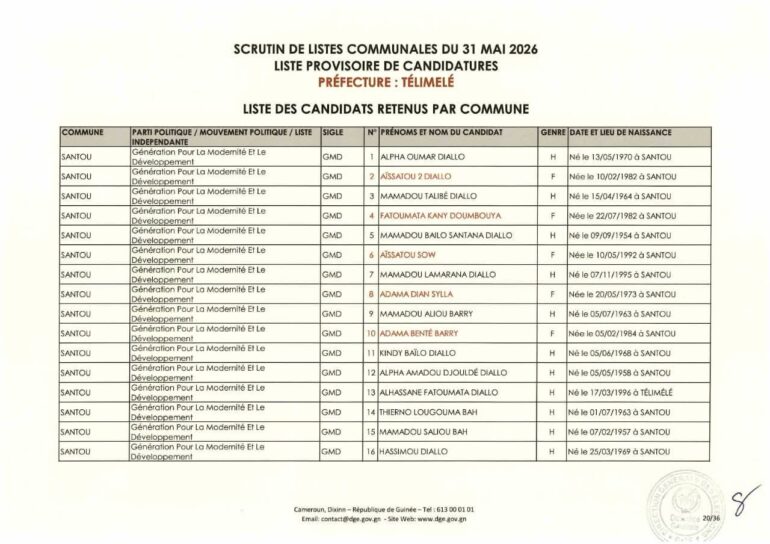 La Direction générale des élections (DGE) a rendu publique une décision portant publication de la liste provisoire des candidatures pour les élections communales du 31 mai 2026 dans la préfecture de Télimélé. Ce document officiel s’inscrit dans le processus électoral en cours, conformément aux dispositions du Code électoral et aux différents décrets encadrant l’organisation du scrutin.