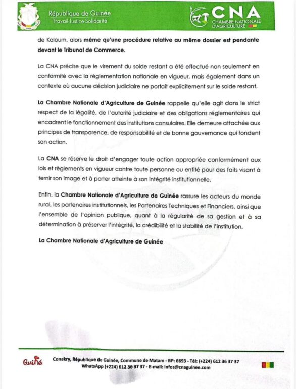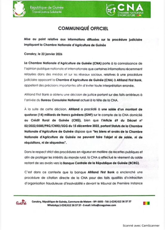 La Chambre Nationale d’Agriculture de Guinée (CNA) tient à apporter des précisions sur les informations circulant dans les médias et sur les réseaux sociaux concernant un litige avec Afriland First Bank. Selon la CNA, les faits à l’origine de la procédure judiciaire remontent à avant l’arrivée du Bureau actuel, et toutes les opérations financières ont été effectuées dans le strict respect de la législation et des procédures en vigueur.