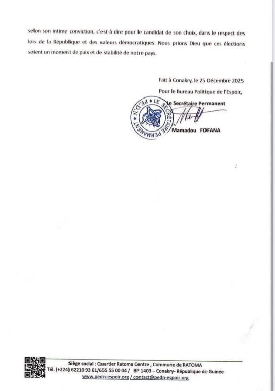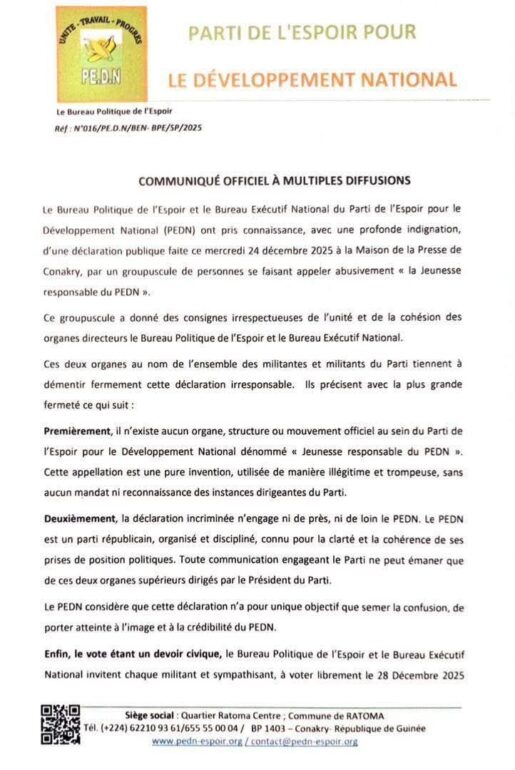 Le Parti de l’Espoir pour le Développement National dément toute consigne de vote qu’on lui aurait attribué dans le cadre de la présidentielle du 28 décembre prochain en Guinée. Dans un communiqué signé par le secrétaire permanent, le PEDN dit n’avoir donné son soutien à un quelconque candidat. Cette sortie selon le parti dirigé par l’ancien Premier Ministre, Lansana Kouyaté fait suite à une déclaration publique la veille faite à la Maison de la Presse de Conakry par »un groupuscule de personnes se faisant appeler abusivement la jeunesse responsable du PEDN ».
