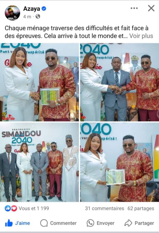C’est une nouvelle qui apporte un climat d’espoir pour le couple de stars. Main dans la main, accompagnés du ministre de la culture et d’autres personnalités publiques, tout porte à croire que Mohamed KAMISSOKO, dit Azaya semble réconcilier avec son épouse, Djélikaba Bintou KOUYATE. Dans la publication sur la page de l’artiste chanteur lui même, on peut lire :