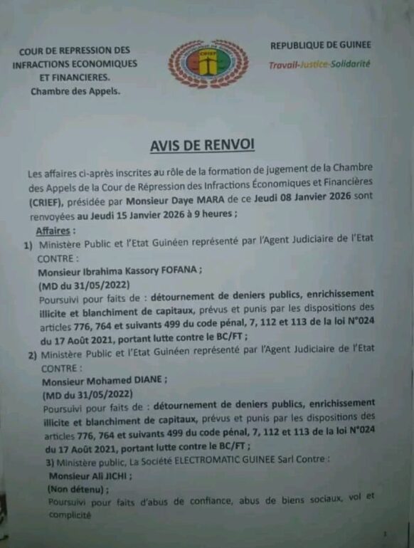 Les audiences en appel concernant les procédures engagées contre Ibrahima Kassory Fofana et Mohamed Diané devant la Chambre des appels de la Cour de répression des infractions économiques et financières (CRIEF) ont été renvoyées au jeudi 15 janvier 2026 à partir de 9 heures.