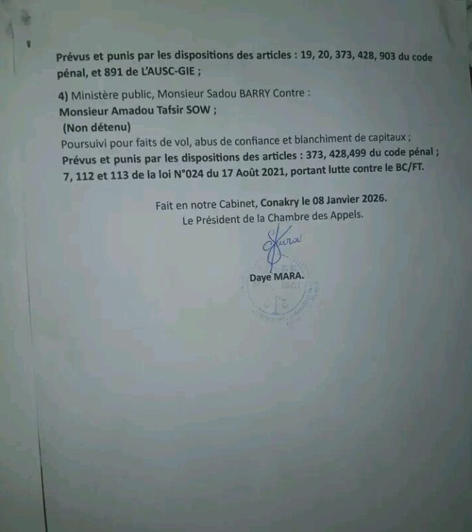 Initialement programmée pour ce jeudi 8 janvier 2026, l’audience devant être présidée par le magistrat Daye Mara, n’a pu se tenir. La juridiction d’appel a ordonné le renvoi de l’examen des dossiers, sans statuer au fonds.