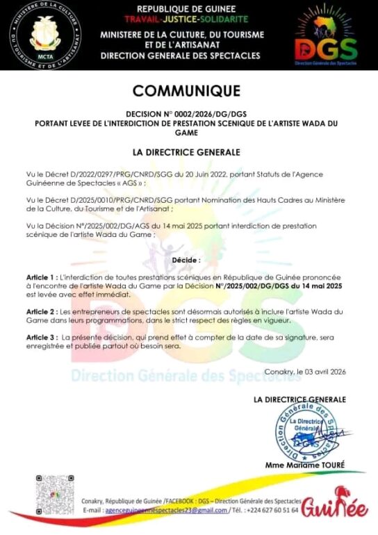 L’artiste Wada du Game est de nouveau autorisé à se produire en public en Guinée. L’interdiction qui pesait sur ses prestations scéniques depuis mai 2025 a été levée, selon une décision rendue publique le 3 avril 2026.