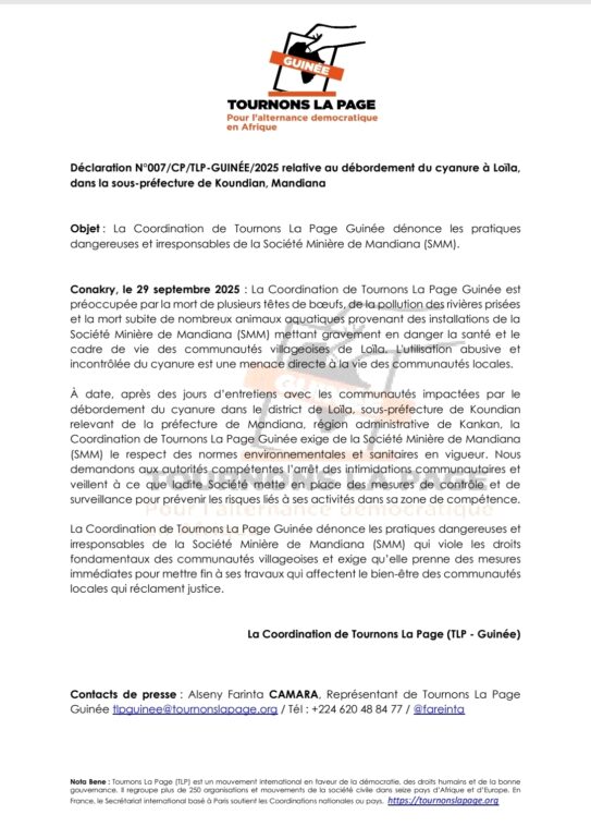 La Coordination guinéenne de Tournons La Page à travers une déclaration en date de dimanche, 28 septembre 2025 dénonce le débordement du cyanure dans la mine de Mandiana, des pratiques qui selon elle, sont « dangereuses et irresponsables » de la Société Minière de Mandiana (SMM), accusée dans cette affaire.