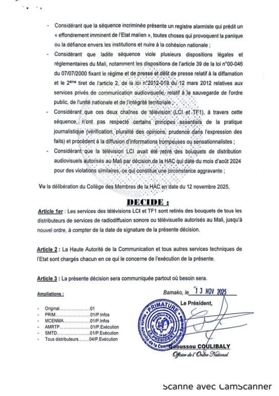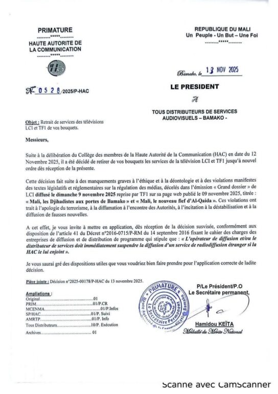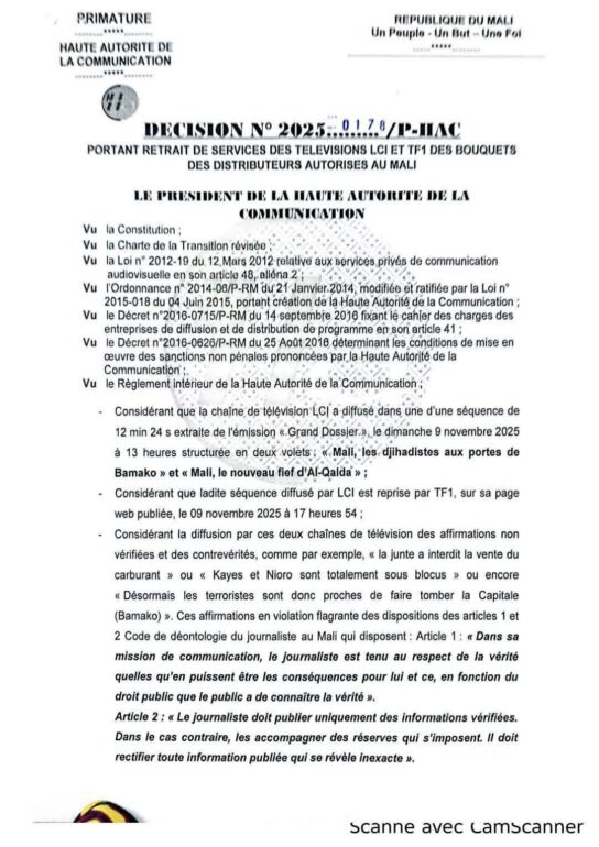 La rupture entre le Mali et son ancien pays colonisateur continue de s’étendre. Le gouvernement malien à travers la Haute Autorité de la Communication vient d’interdire TF1 et LCI. Pour cause, la HAC parle de manquements graves à l’éthique et à la déontologie décelés dans l’émission les « Grand Dossier » de LCI en date du 09 réprise par la TF1.