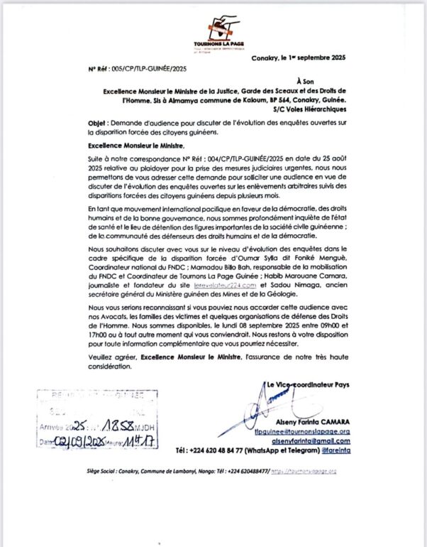 A travers une lettre en date du 1er septembre 2025, La Coordination de Tournons La Page-Guinée demande une audience auprès du Ministre de la Justice et des Droits de l’Homme.