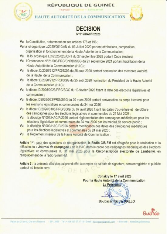 Il s’agit d’une décision en date de ce 17 avril 2026. La Haute Autorité de la Communication-HAC retire la radio Soleil FM de la réalisation et la diffusion du Journal de campagne dans Circonscription électorale de Lambanyi. Elle est remplacée par la Radio CIS FM désignée par l’instance de régulation des médias en Guinée.