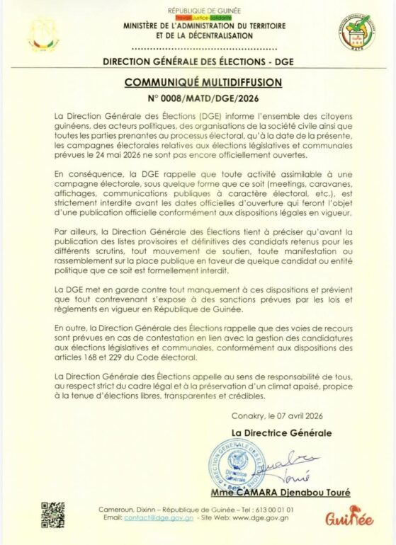 À quelques semaines des scrutins législatifs et communaux prévus le 24 mai 2026, la Direction Générale des Élections rappelle que les campagnes électorales ne sont pas encore ouvertes et interdit toute activité assimilée à de la propagande politique. Pour rappel, cette mise en garde de la DGE intervient à peine quelques heures, après celle de la Haute Autorité de la Comunnication-HAC.