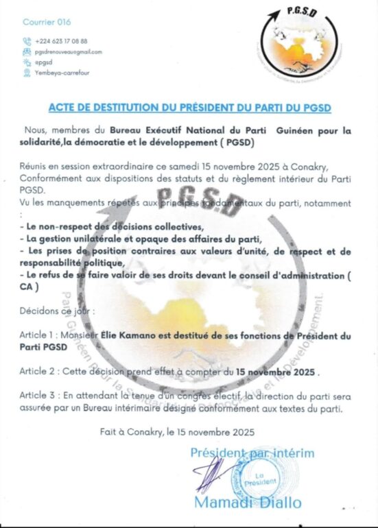 Le reggae man reconverti en politique n’est plus président du Parti Guinéen pour la Solidarité, la Démocratie et le Développement (PGSD). La décision fait suite à un session extraordinaire ce samedi 15 novembre 2025 à Conakry, tenu par des membres du bureau politique qui l’on rendu public.