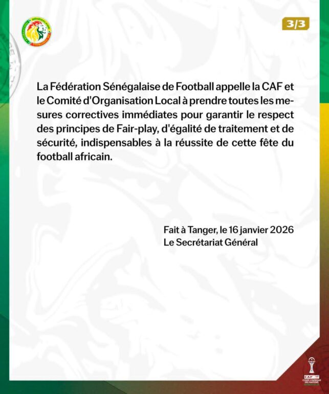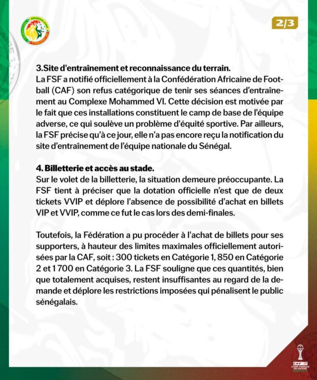 Dans un communiqué à quelques heures de la grande finale de la Coupe d’Afrique des Nations-CAN, la Fédération Sénégalaise de Football-FSF) porte à la connaissance de l’opinion publique nationale et internationale, ainsi que des instances organisatrices, ses vives inquiétudes concernant plusieurs dysfonctionnements constatés en marge de la préparation de la finale de la Coupe d’Afrique des Nations.
