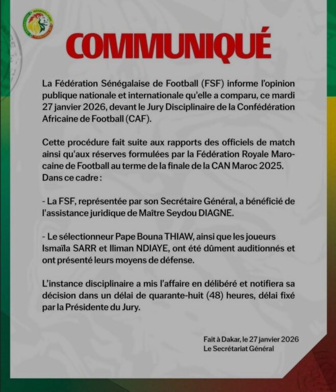 La Fédération Sénégalaise de Football (FSF) a été entendue ce mardi 27 janvier 2026 par le Jury disciplinaire de la Confédération Africaine de Football (CAF), suite aux rapports des officiels de match et aux réserves formulées par la Fédération Royale Marocaine de Football après la finale de la CAN Maroc 2025. Plusieurs responsables et joueurs sénégalais ont été auditionnés, tandis que la décision finale est attendue dans les prochaines 48 heures.