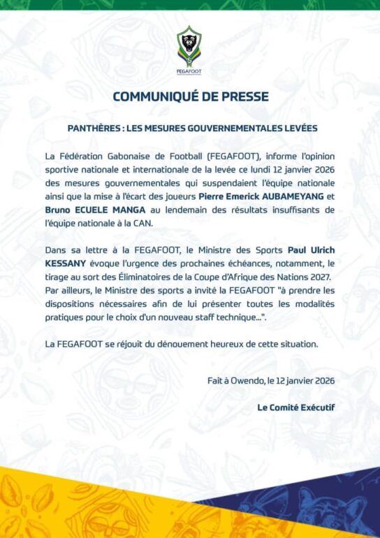 La tension autour des Panthères du Gabon prend fin. La Fédération gabonaise de football a annoncé, dans la soirée de ce lundi 12 janvier 2026, la levée des mesures gouvernementales qui avaient suspendu la sélection nationale au lendemain des résultats jugés insuffisants lors de la Coupe d’Afrique des Nations Maroc 2025.
