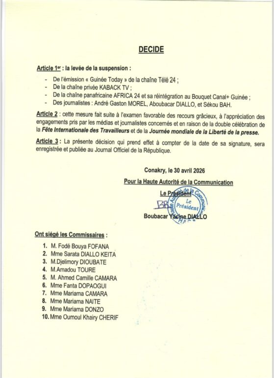 La HAC annonce la levée des mesures visant l’émission « Guinée Today » de Télé 24, KABACK TV, ainsi que la chaîne panafricaine AFRICA 24, désormais réintégrée dans le bouquet Canal+ Guinée. Les journalistes André Gaston Morel, Aboubacar Diallo et Sékou Bah sont également concernés par cette mesure.