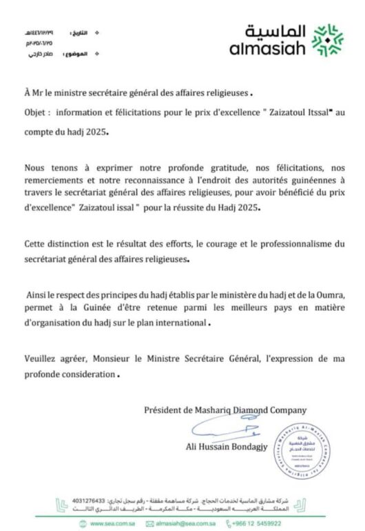 L’information est partgaée sur la page Meta du Secrétariat Général des Affaires Religieuses de Guinée. Après l’annonce, cette lettre de félicitations n’est qu’une confirmation désormais.