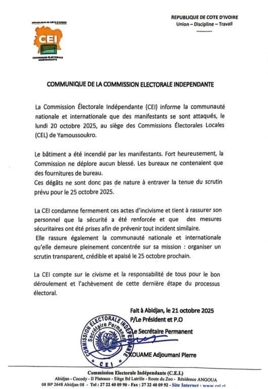 La Commission Électorale Indépendante dans un communiqué rendu public mardi informe de l’incendie par des manifestants, du siège des Commissions Électorales Locales (CEL) de Yamoussoukro. Selon le document ces faits qui se produit lundi 20 octobre 2025 n’ont causé aucun blessé. Les bureaux ne contenaient que des fournitures de bureau. Des dégâts qui selon la Commission ne sont pas de nature à entraver la tenue du scrutin prévu pour le 25 octobre 2025.