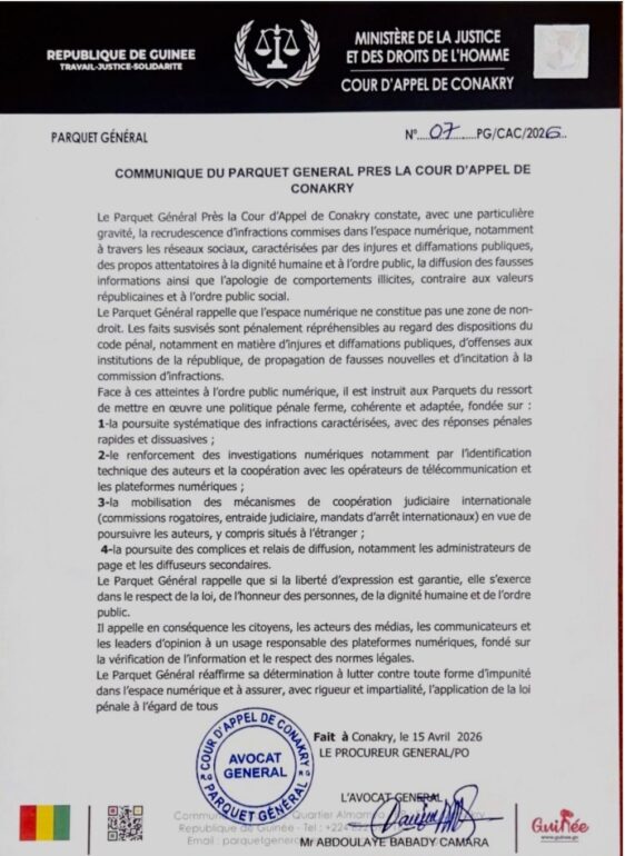 Face à la recrudescence des dérives sur les réseaux sociaux, le Parquet général près la Cour d’appel de Conakry annonce une riposte judiciaire ferme. Injures, diffamations, fausses informations et incitations illicites sont désormais dans le viseur des autorités, qui entendent renforcer les poursuites, y compris au-delà des frontières, tout en rappelant que la liberté d’expression s’exerce dans le strict respect de la loi et de la dignité humaine.