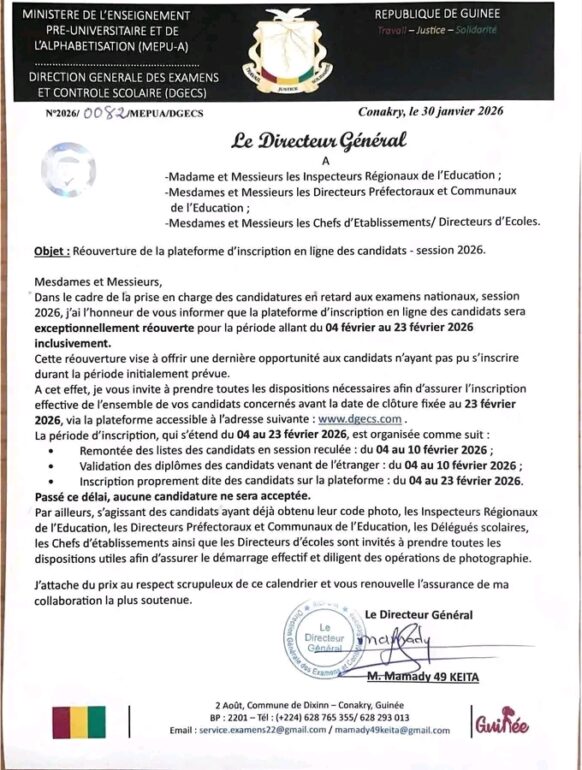 Le ministère de l’Enseignement pré-universitaire et de l’Alphabétisation (MEPU-A), à travers la Direction générale des examens et du contrôle scolaire (DGECS), a annoncé la réouverture exceptionnelle de la plateforme d’inscription en ligne des candidats aux examens nationaux, session 2026.