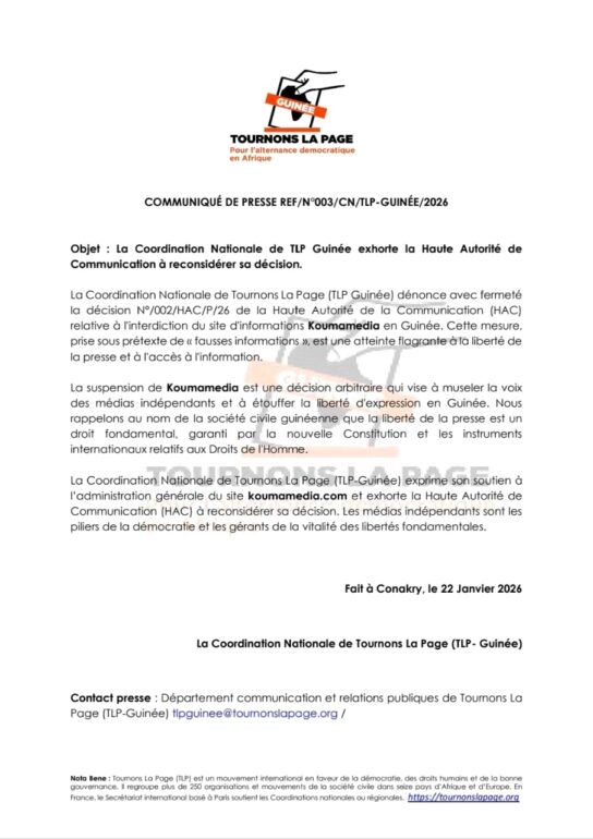Dans un communiqué dont copie est parvenue à notre rédaction, la Coordination Nationale de Tournons La Page (TLP Guinée) dénonce avec fermeté la décision N°/002/HAC/P/26 de la Haute Autorité de la Communication (HAC) relative à l’interdiction du site d’informations Koumamedia en Guinée. Selon le mouvement, cette mesure, prise sous prétexte de « fausses informations, est une atteinte flagrante à la liberté de la presse et à l’accès à l’information ».