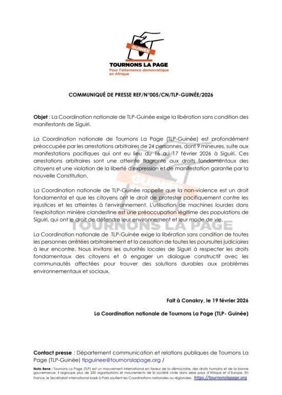 La Coordination nationale de Tournons La Page (TLP-Guinée) se dit profondément préoccupée par les dernières arrestations qu’elle qualifie d’arbitraires de 24 personnes, dont 9 mineures, suite aux manifestations qui ont eu lieu du 16 au 17 février 2026 à Siguiri. Selon le mouvement, ces interpellations sont une atteinte flagrante aux droits fondamentaux des citoyens et une violation de la liberté d’expression et de manifestation garantie par la nouvelle Constitution.