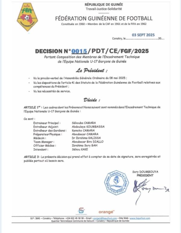 Dans une décision rendue publique ce mercredi, 03 septembre 2025, la Fédération Guinéenne de Football-FGF a procédé à la nomination de plusieurs cadres pour l’Encadrement Technique de l’Equipe Nationale U-17 Garçons.