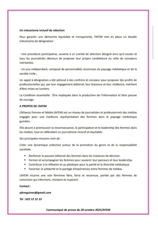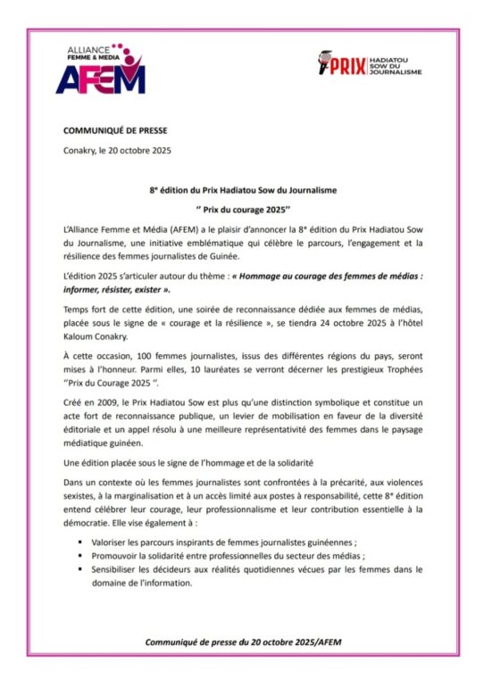 Placée sous le signe du « courage et la résilience », l’édition 2025 se tiendra 24 octobre 2025 à l’hôtel Kaloum à Conakry, annonce l’Alliance Femme et Média (AFEM).