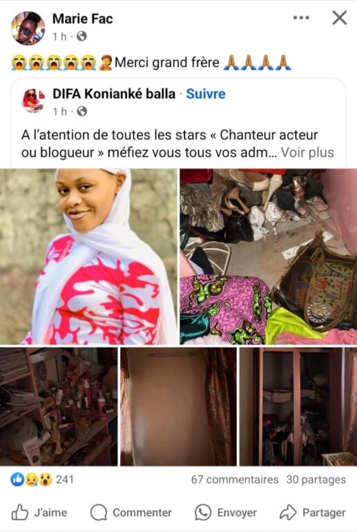 « Cette jeune fille est venue chez Marie Fac avant hier en tant que fane. Étant gentille et généreuse, celle ci l’a accueilli à bras ouverts et a même accepté de passer une nuit avec elle.Vous n’allez pas croire, c’est dans cette même nuit qu’elle est sortie en douce tout en volant des objets de valeurs à savoir: des perruques des chaînes en argent une somme de 4.500.000 et pleins de chaussures de Marie », peut on lire.