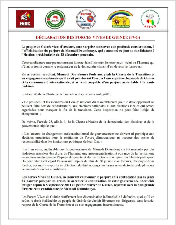 Selon le document, cette candidature marque un tournant « funeste dans l’histoire de notre pays : celui où l’homme qui s’était présenté comme le restaurateur de la démocratie choisit d’en devenir le fossoyeur », lit-on avant d’ajouter qu’en « se portant candidat, Mamadi Doumbouya foule aux pieds la Charte de la Transition et les engagements solennels qu’il avait pris devant Dieu, la Cour suprême, le peuple de Guinée et la communauté internationale, et se rend coupable d’un parjure assimilable à la haute trahison ».