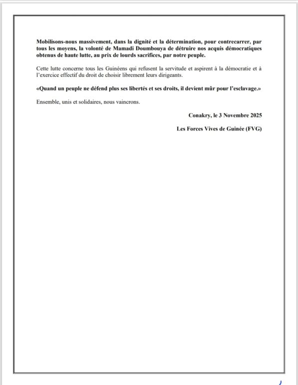 A peine la candidature du Général Doumbouya déposée que les Forces Vives de Guinée se sont fait entendre. Dans une déclaration ce lundi même, 03 novembre 2025, les FVG se disent surprises et consterner par cette annonce.