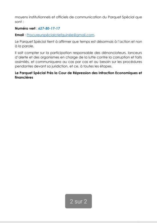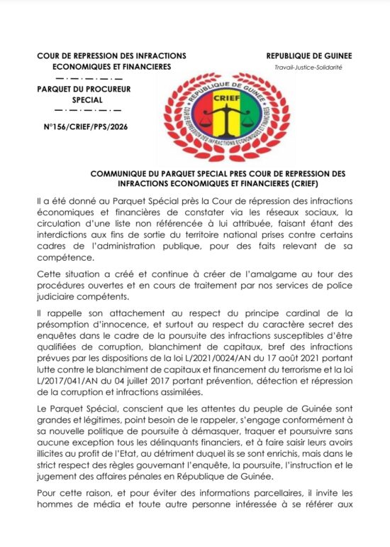 Le Parquet spécial près la CRIEF dénonce la circulation sur les réseaux sociaux d’une liste non authentifiée lui étant attribuée, évoquant des interdictions de sortie du territoire visant des cadres publics. L’institution met en garde contre les amalgames autour des procédures en cours, rappelle le principe de présomption d’innocence et le caractère confidentiel des enquêtes, tout en réaffirmant sa détermination à poursuivre les infractions économiques dans le strict respect de la loi.