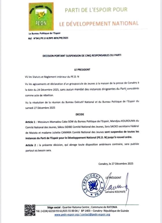 La tension ne baisse pas au Parti de l’Espoir pour le Développement National-PEDN. Après la sortie le 24 décembre dernier d’un groupe de jeune du parti apportant leur soutien au candidat Mamadi Doumbouya à la présidentielle du 28 décembre, Lansana Kouyaté décide de suspendre cinq responsables, visiblement derrière ce qu’il qualifie de « rébellion » dans une décision publiée sur sa page Meta.