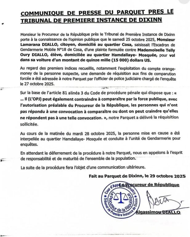 « Le Procureur de la République près le Tribunal de Première Instance de Dixinn porte à la connaissance de l’opinion publique que le samedi 25 octobre 2025, Monsieur Lamarana DIALLO, citoyen, domicilié au quartier Cosa, saisissait l’Escadron de Gendarmerie Mobile N°18 de Cosa, d’une plainte formulée contre Mademoiselle Telly Oury DIALLO, élève, domiciliée au quartier Hamdallaye- Mosquée, pour vol dans sa voiture d’un montant de quinze mille (15000) dollars US ».