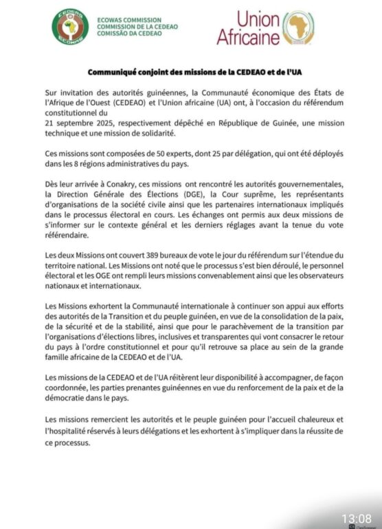 Au terme d’une mission technique et de solidarité sur invitation des autorités guinéennes, les délégations de la Communauté économique des États de l’Afrique de l’Ouest (CEDEAO) et l’Union africaine (UA) ont fait le compte rendu de leur visite en Guinée. Cette présence s’inscrivait notamment dans le cadre de l’observation du référendum constitutionnel du 21 septembre 2025.