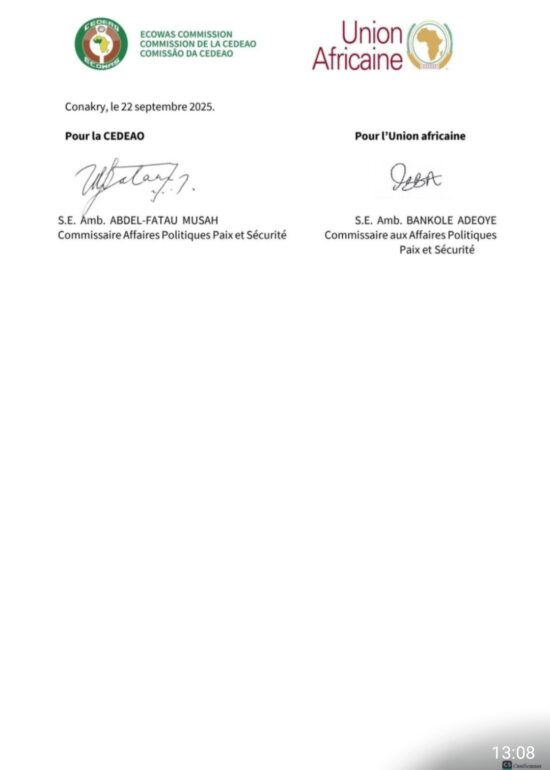 « Les missions de la CEDEAO et de l’UA réitèrent leur disponibilité à accompagner, de façon coordonnée, les parties prenantes guinéennes en vue du renforcement de la paix et de la démocratie dans le pays ».
