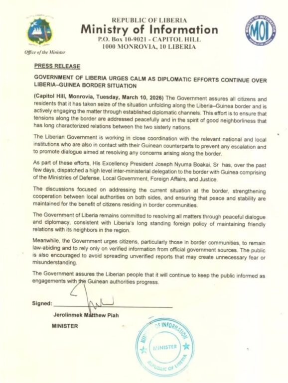 Face aux tensions signalées ces derniers jours à la frontière entre la Guinée et le Libéria, le gouvernement libérien affirme suivre la situation de près. Dans un communiqué publié mardi 10 mars 2026, les autorités de Monrovia assurent avoir engagé des démarches diplomatiques avec Conakry et appellent les populations, notamment celles des zones frontalières, à faire preuve de calme et de responsabilité.