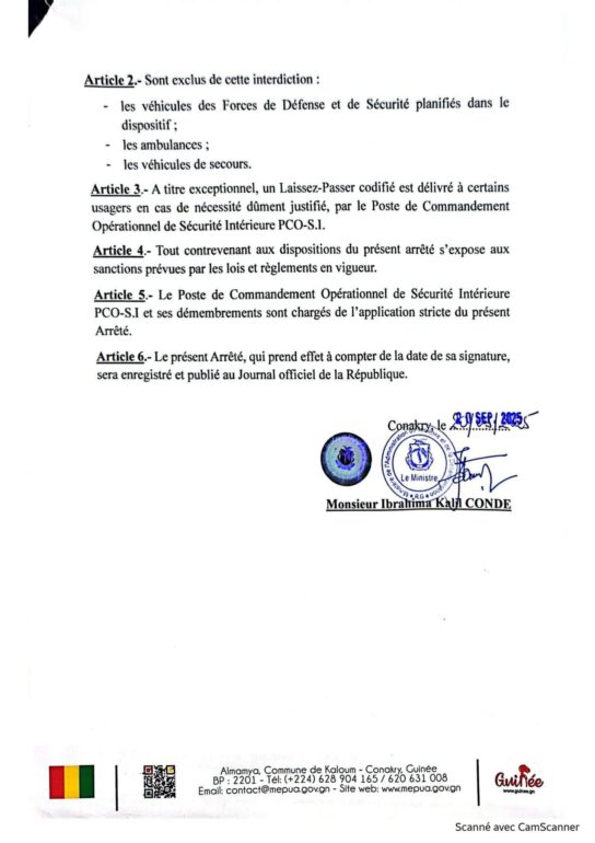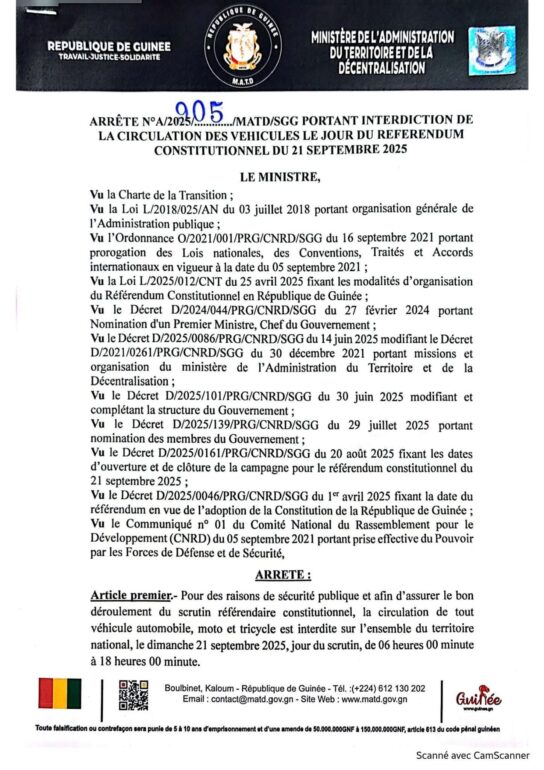 Le document du Ministère de l’Administration du Territoire-MATD et de la Décentralisation évoque des raisons de sécurité publique envue d’assurer le bon déroulement du scrutin référendaire constitutionnel.  Il est interdit la circulation de tout véhicule automobile, moto et tricycle est interdite sur l’ensemble du territoire national, le dimanche 21 septembre 2025, jour du scrutin, de 06 heures 00 minute à 18 heures 00 minute.