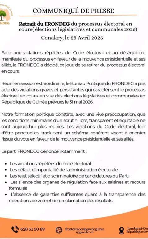 Le Front Démocratique de Guinée a annoncé ce lundi, 28 avril 2026 son retrait du processus électoral en cours pour les élections législatives et communales prévues le 31 mai 2026. La décision, prise en session extraordinaire du Bureau Politique, intervient après plusieurs alertes du parti.